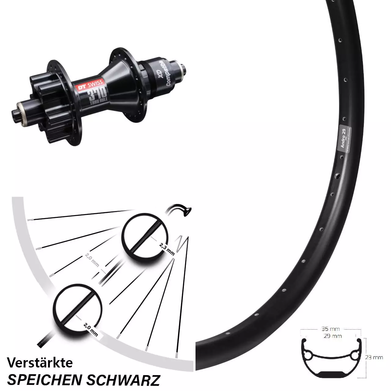 Technische Daten Hinterrad Ryde Andra 29 Disc schwarz und Nabe DT Swiss 370 Disc 6-Loch SRAM XD 5/135