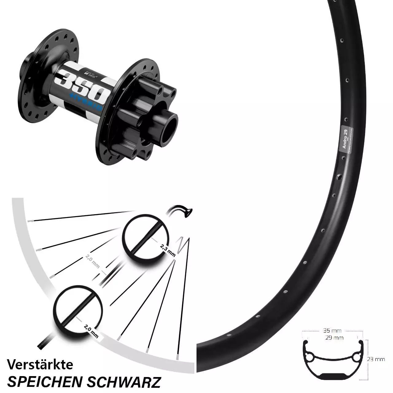 Technische Daten Vorderrad Ryde Andra 29 Disc schwarz mit Nabe DT Swiss 350 Hybrid Disc 6 Loch 15/100