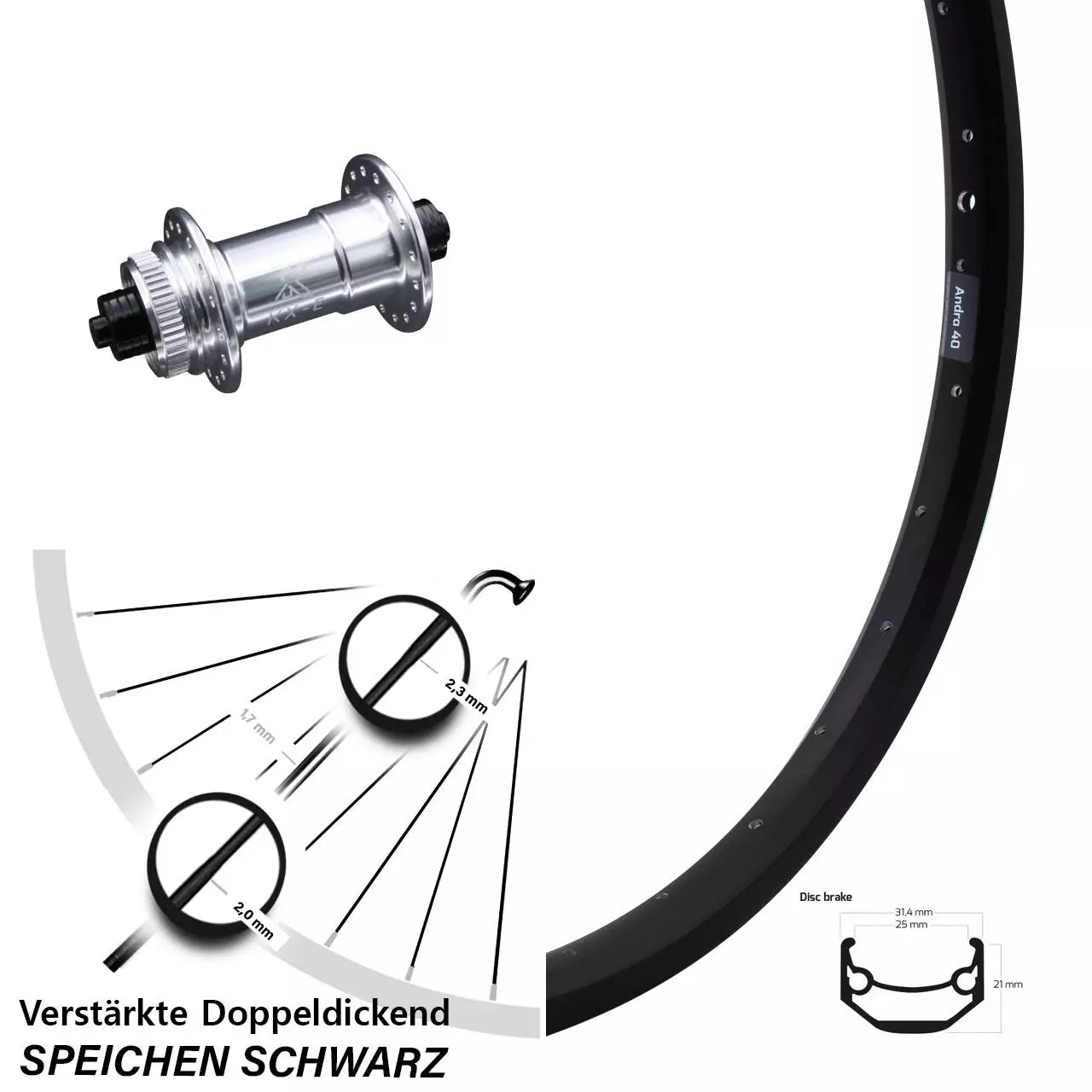 Technische Daten Vorderrad Ryde Andra 40 Disc schwarz mit Nabe KX-E Vorderradnabe Centerlock 5/100 silbern