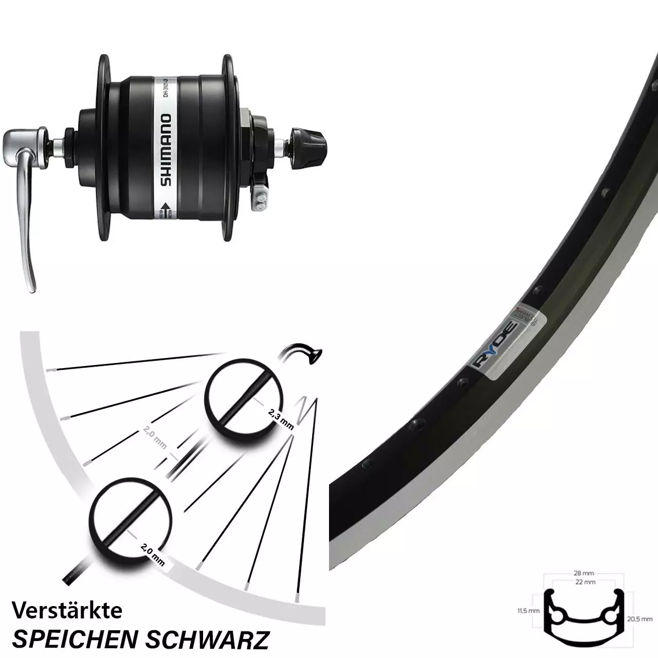 Technische Daten vorderes Laufrad Ryde Andra 35 Felgenbremse schwarz & Nabendynamo Shimano DH-3N31-QR schwarz