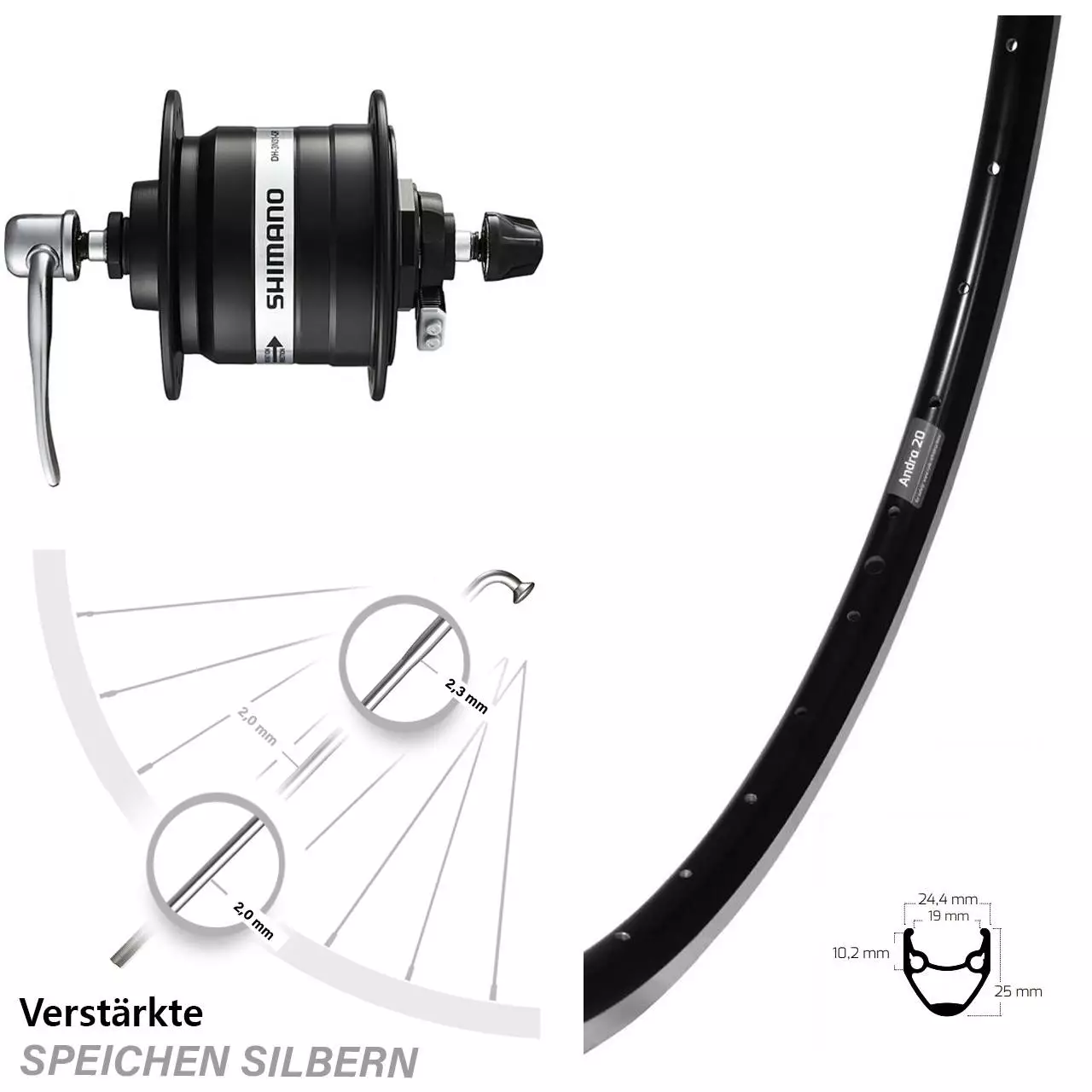 Technische Daten vorderes Laufrad Ryde Andra 20 Felgenbremse schwarz & Nabendynamo Shimano DH-3N31-QR schwarz