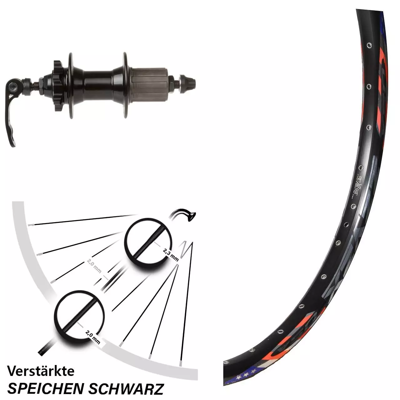 Dieses Hinterrad ist mit verstärkten Speichen, sogenannten Eindickendspeichen (auch ID oder ED genannt) bestückt. Die Speichen sind im empfindlichen und bruchgefährdeten Bogenbereich mit 2,34 mm Querschnitt besonders verstärkt ausgeführt. Die restliche Speiche weist eine Dicke von 2,0 mm auf. Dadurch kann das Laufrad insgesamt höher belastet werden, sei es durch schwere Fahrer oder mit viel Gepäck.