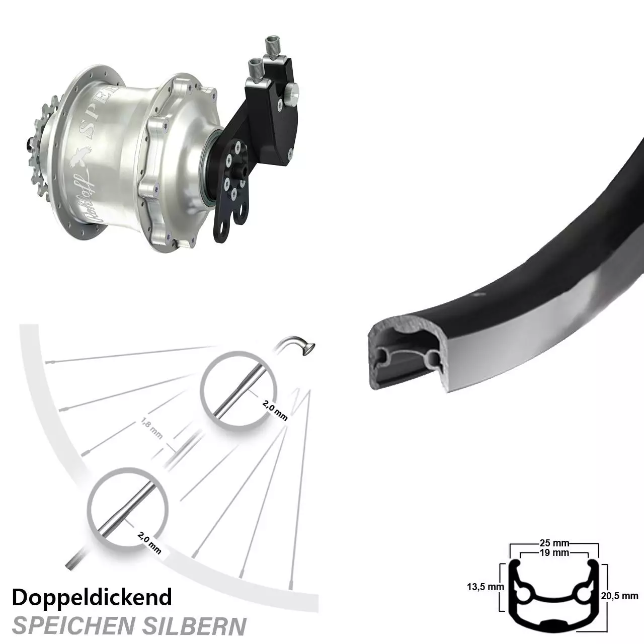 Speichen: Diese Doppeldickendspeiche aus rostfreiem und hochwertigen Edelstahl vom Markenhersteller Sapim aus Belgien ist eine extra leichte Speiche. Sie ist speziell für leichte Laufräder geeignet. Sapim hat hier einen ausgewogenen Mittelweg zwischen Gewicht und Stabilität gefunden. Diese leichte Doppeldickendspeiche ist im besonders bruchgefährdeten Bereich der Nabe und am Gewindeende mit 2,0 mm besonders stabil ausgeführt. Im Mittelteil weist sie „schlanke“ 1,8 mm auf, was Gewicht spart. Zudem fängt die Speiche dank ihrer guten Elastizität und der hohen Festigkeit am Mittelteil mit 1300 N/mm2 auch hohe Zug- und Druckkräfte hervorragend ab. Die endverstärkte Edelstahl-Speiche mit einem Durchmesser von 2,0 mm, 1,8 mm und 2,0 mm kommt beim MTB (Mountainbike) und Rennrad zum Einsatz.