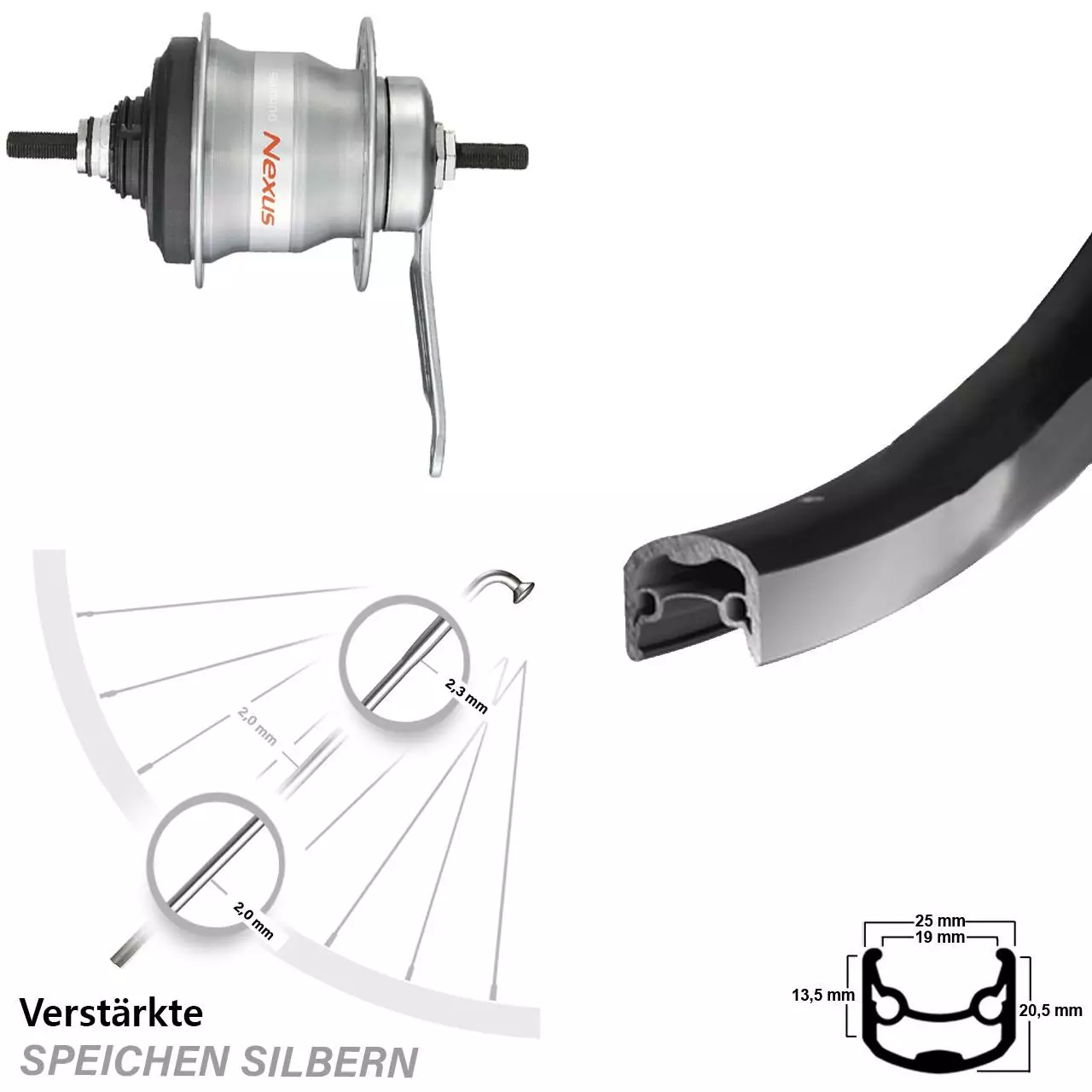 Technische Daten Hinterrad Ryde Andra 30 Felgenbremse schwarz und Nabe Shimano Nexus 7-Gang SG-7C30 silbern