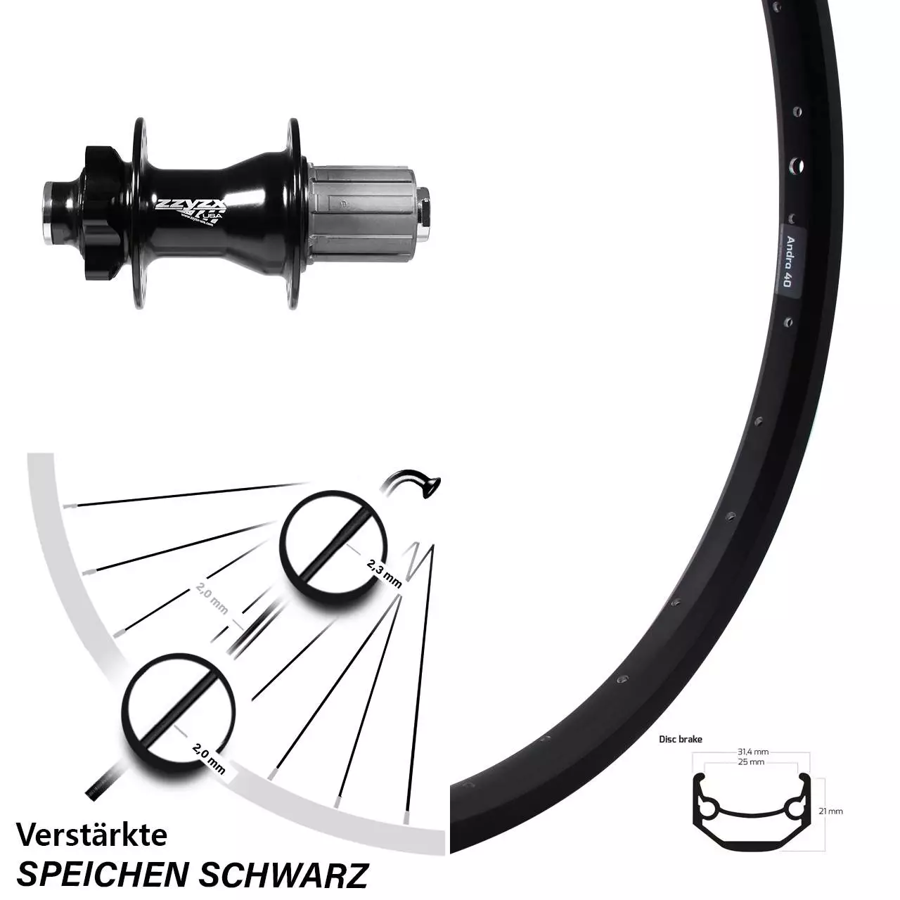 Technische Daten Hinterrad Ryde Andra 40 Disc schwarz und Nabe Formula ZZYZX DC-36-1 schwarz