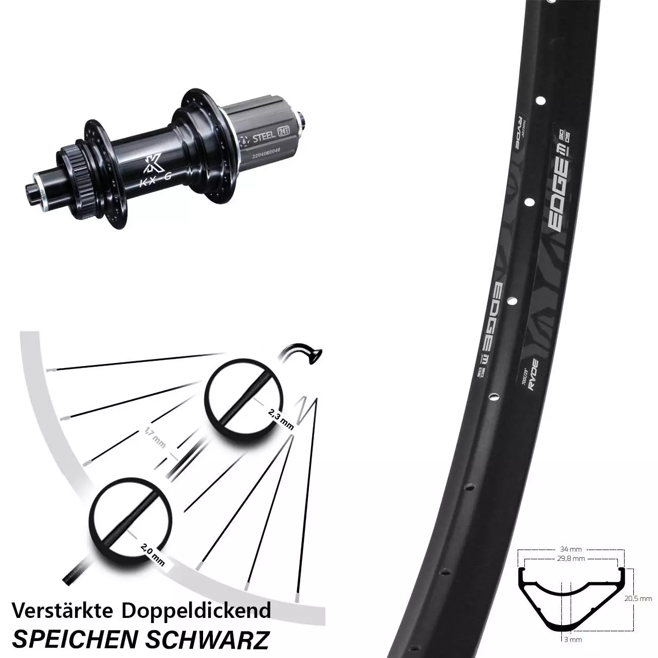 Produktbeschreibung Hinterrad Ryde Edge M30-622 ETRTO 29 Zoll verstärkt mit KX-GS 5×135 Centerlock Nabe
