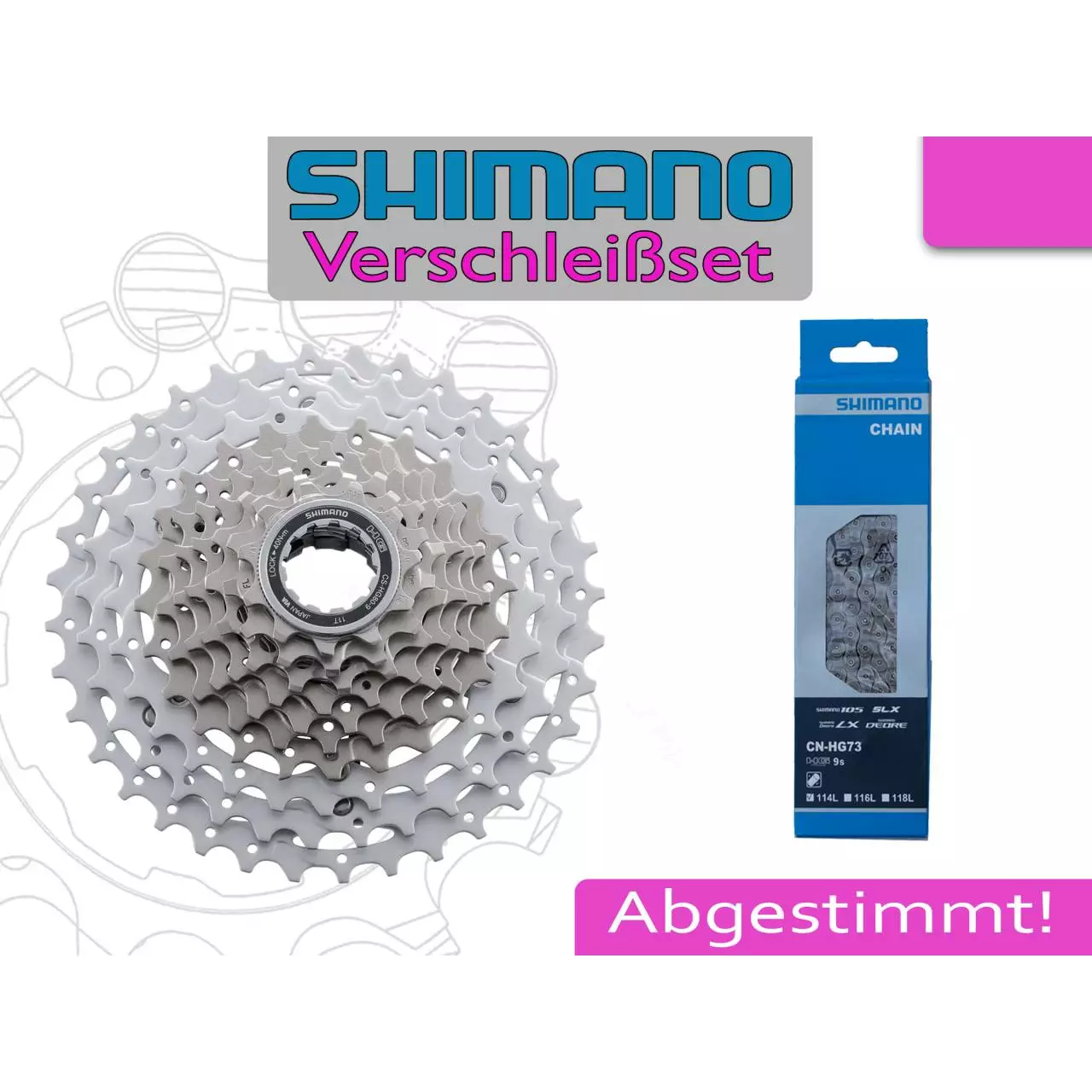 Verschlissene Antriebsteile am Fahrrad verhindern nicht nur den gewohnten Fahrkomfort und das reibungslose Vorankommen, mitunter stellen die fehlerhaften Einzelteile auch ein Sicherheitsrisiko dar. Mit den nützlichen Verschleiß-Sets aus unserem Shop können Sie diesem Risiko einfach und günstig vorbeugen. Kette und Zahnkranz arbeiten beim Fahrradantrieb eng zusammen und werden deshalb oft auch zugleich gewechselt. In diesem Komplett-Set erhalten Sie die beliebte und zuverlässige SHIMANO Fahrradkette 9-fach sowie den passenden SHIMANO Zahnkranz 9-fach mit folgenden Abstufungen: 11-13-15-17-20-23-26-30-34 Zähne. Die Kette ist kompatibel zu den geläufigen Kettenschaltungen mit 9 Ritzeln hinten. Gehen Sie beim Antrieb Ihres Bikes keine Kompromisse ein.