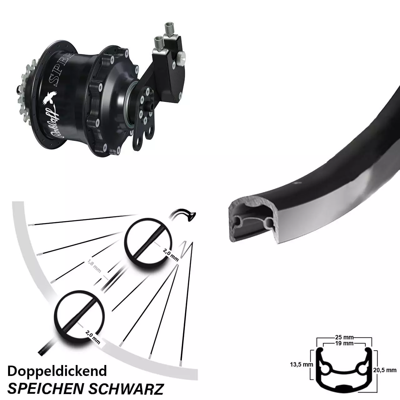 Speichen: Diese Doppeldickendspeiche aus rostfreiem und hochwertigen Edelstahl vom Hersteller Sapim aus Belgien ist eine extra leichte Fahrradspeiche. Sie ist speziell für leichte Laufräder geeignet. Sapim hat hier einen hervorragenden Kompromiss zwischen Stabilität und Gewicht gefunden. Diese leichte Doppeldickendspeiche ist im besonders bruchgefährdeten Bereich der Nabe und am Gewindeende mit 2,0 mm besonders kräftig ausgeführt. Im Mittelteil weist sie „schlanke“ 1,8 mm auf, was Gewicht spart. Zudem fängt die Speiche dank ihrer guten Elastizität und der hohen Festigkeit am Mittelteil mit 1300 N/mm2 auch hohe Zug- und Druckkräfte hervorragend ab. Die endverstärkte Edelstahl- Fahrradspeiche mit 2,0 mm, 1,8 mm und 2,0 mm im Durchmesser kommt beim MTB (Mountainbike) und Rennrad zum Einsatz.