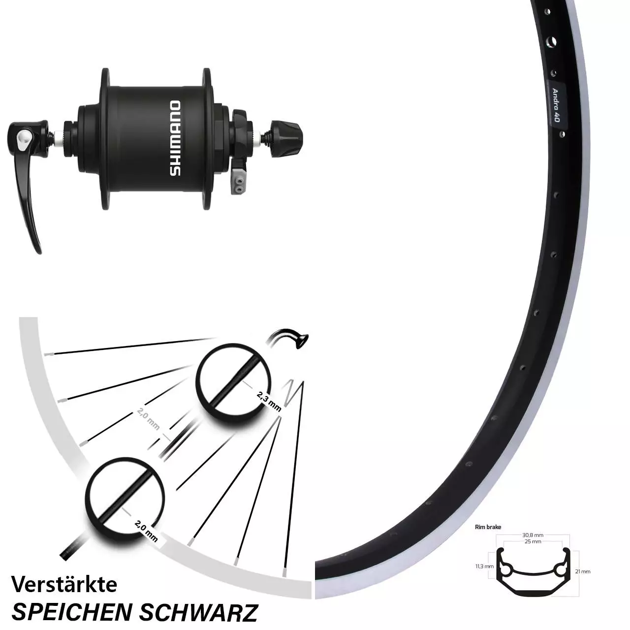 Technische Daten vorderes Laufrad Ryde Andra 40 Felgenbremse schwarz & Nabendynamo Shimano DH-T4000-1N schwarz